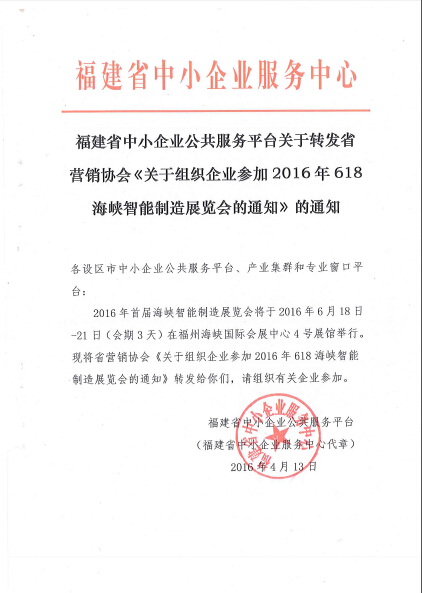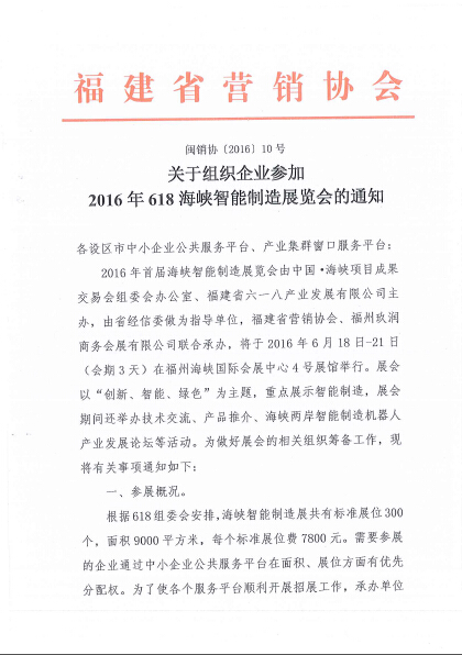 关于组织企业参加2016年618海峡智能制造展览会的通知